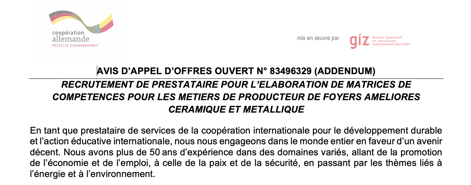 RECRUTEMENT DE PRESTATAIRE POUR L’ELABORATION DE MATRICES DE COMPETENCES POUR LES METIERS DE PRODUCTEUR DE FOYERS AMELIORES CERAMIQUE ET METALLIQUE