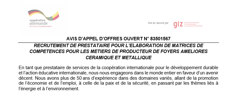 AVIS D’APPEL D’OFFRES OUVERT N° 83501567 : RECRUTEMENT DE PRESTATAIRE POUR L’ELABORATION DE MATRICES DE COMPETENCES POUR LES METIERS DE PRODUCTEUR DE FOYERS AMELIORES CERAMIQUE ET METALLIQUE