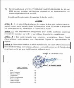 L’arrêté du maire de Matéri intervient après une série d’attaques enregistrées dans cette commune. Matéri est située à la lisière du Burkina Faso et du Togo .C’est une commune du nord Bénin touchée par le terrorisme. En juin 2022, cette commune a été le théâtre d’une attaque terroriste. L’attaque du commissariat de police de Dassari par les individus armés avait fait quatre morts. L’armée et la police sont déployées dans cette commune.